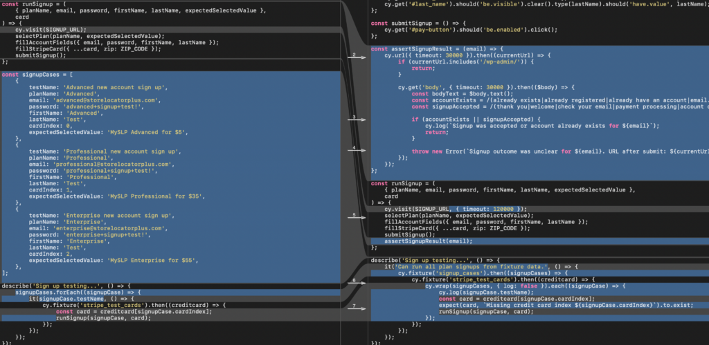 Unlike standard PHP and JavaScript, which AI has become fairly proficient at when writing new code, it turns out writing Cypress test specifications appears to be a new challenge for AI. It is likely due to the fact that things like Cypress specifications are built on a myriad of higher level JavaScript layers, frameworks to be more precise, that are combined in novel ways. The AI has far less training with these models as few companies write E2E test cases for their applications and of those that do few publish online. These extra layers of logic also rely on some knowledge of the application output specifically the exact HTML structure that is rendered by the underlying SaaS application.