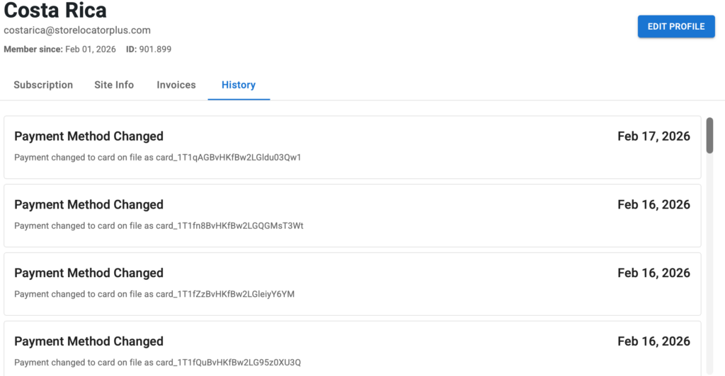 The history tab is showing the change card operation is working via the \MySLP_User::__set calls when the recurring payment data is stored in the User meta array for persistent storage. This is fired from inside \stripe\MySLP_Stripe_Payments::change_card via $this->myslp->Recurring_Payments->add_payment_data(…).