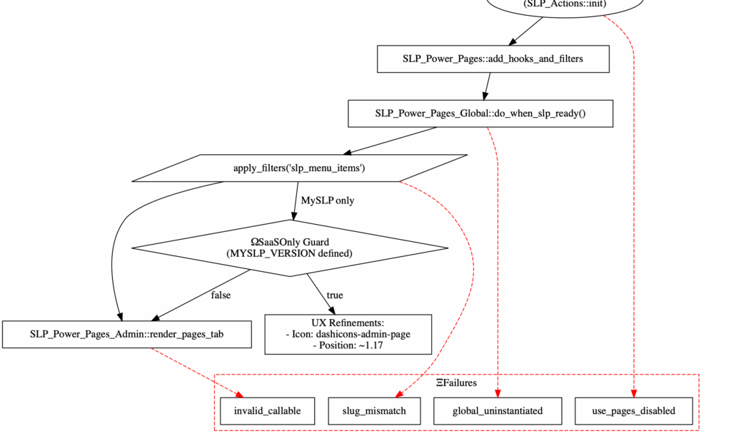 • Execution Trace: From do_action(‘slp_init_complete’) → add_hooks_and_filters → apply_filters(‘slp_menu_items’) .